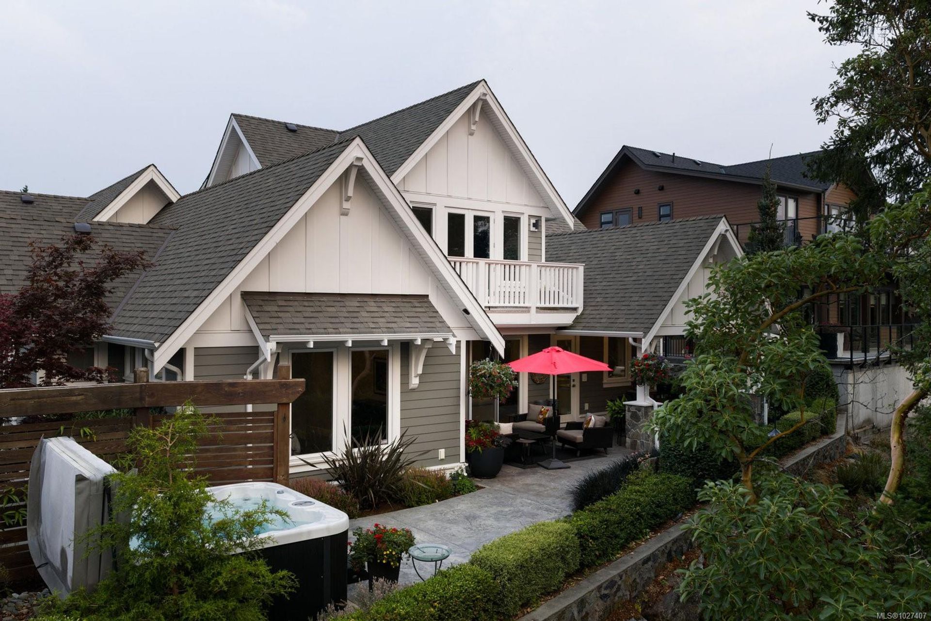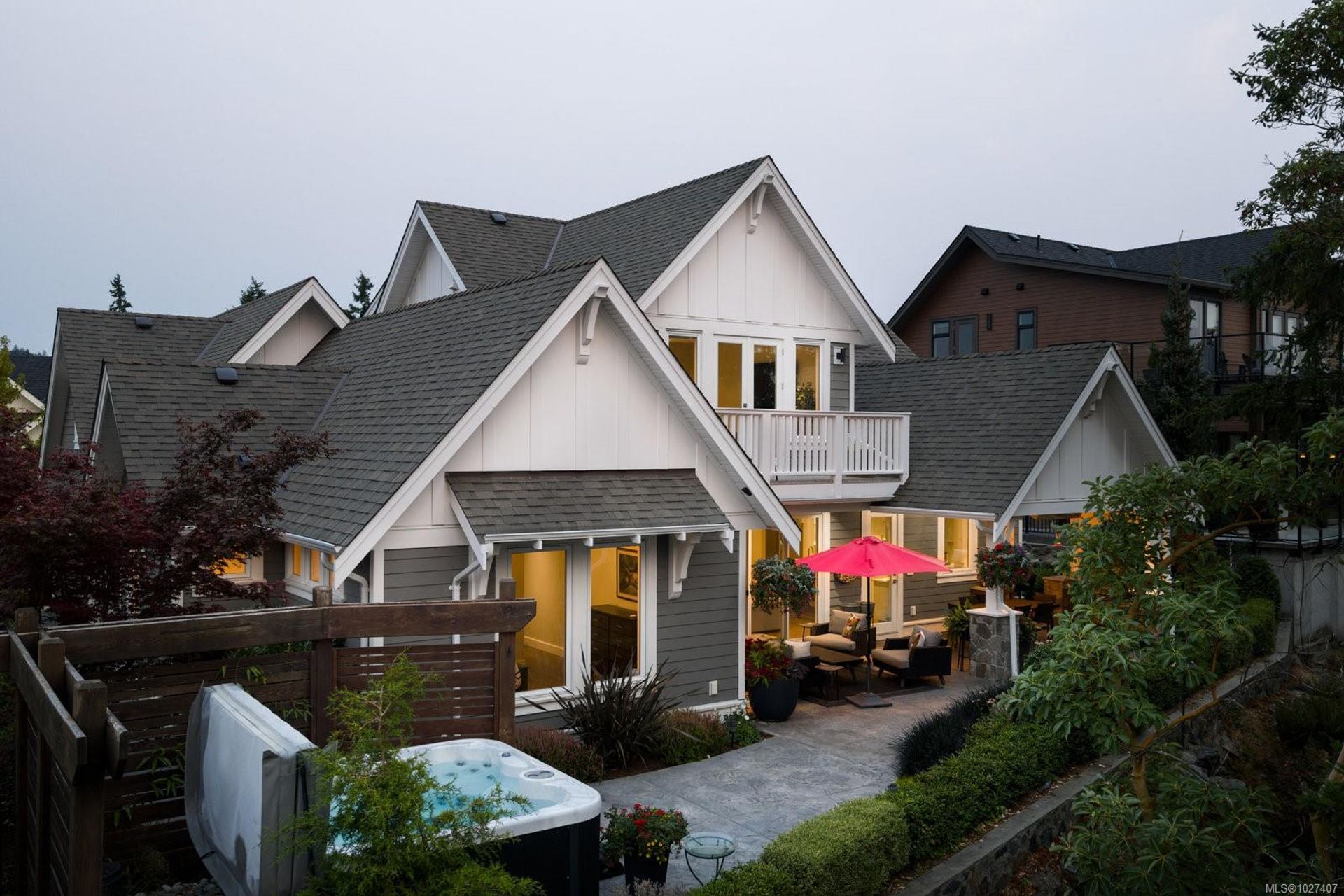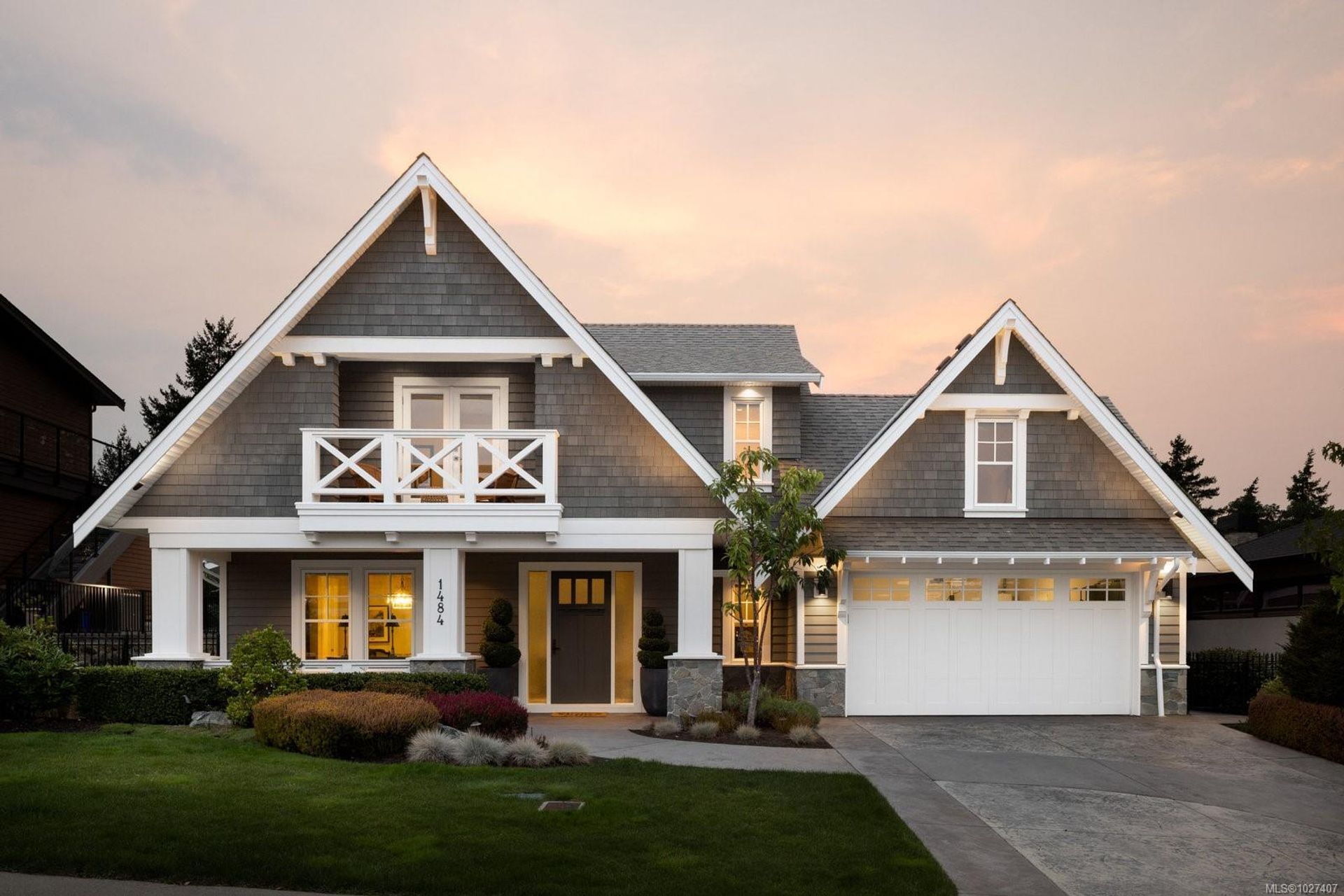 Welcome to 1484 Pebble Place, a distinguished Arts and Crafts residence tucked within the exclusive Cypress neighbourhood bordering Goldstream Provincial Park.Built by KC Custom Designs, this 4 bed/4 bath home blends timeless architecture with exceptional craftsmanship and thoughtful detail throughout.The main level showcases a chef-inspired kitchen with a Miele range, double wall ovens, oversized island, walk-in pantry, and separate dining room.The living room is beautifully anchored by a statement fireplace with custom built-ins, offering an inviting gathering space.The primary bedroom features a spa-like 5-piece ensuite,soaker tub,and seamless walkout to the expansive west-facing patio. Upstairs offers two additional bedrooms,a family room with wet bar,built-in office workspace, and a versatile bedroom/bonus rec room.Enjoy the heated covered outdoor dining area with built-in BBQ station or relax in the private hot tub overlooking the mountains. Individual Golf Membership available!